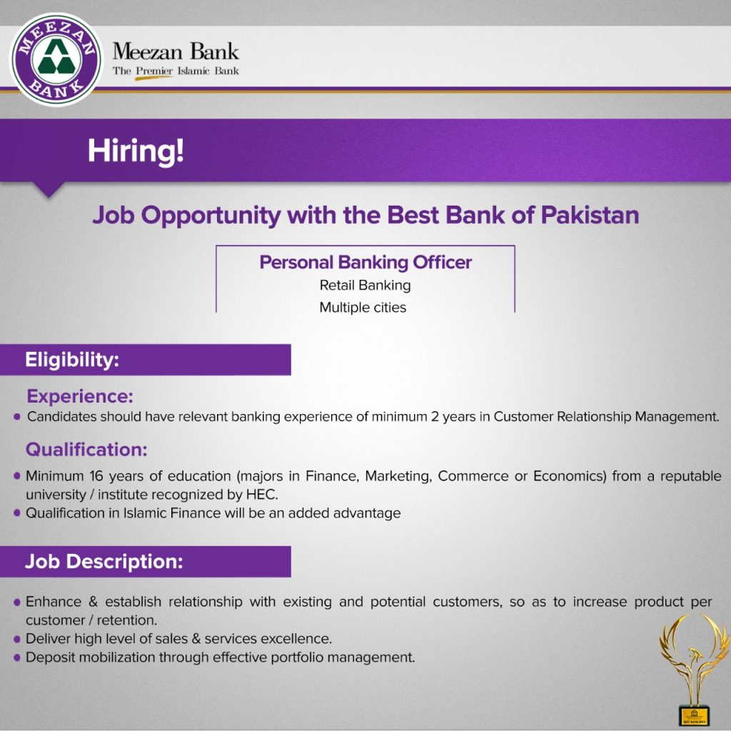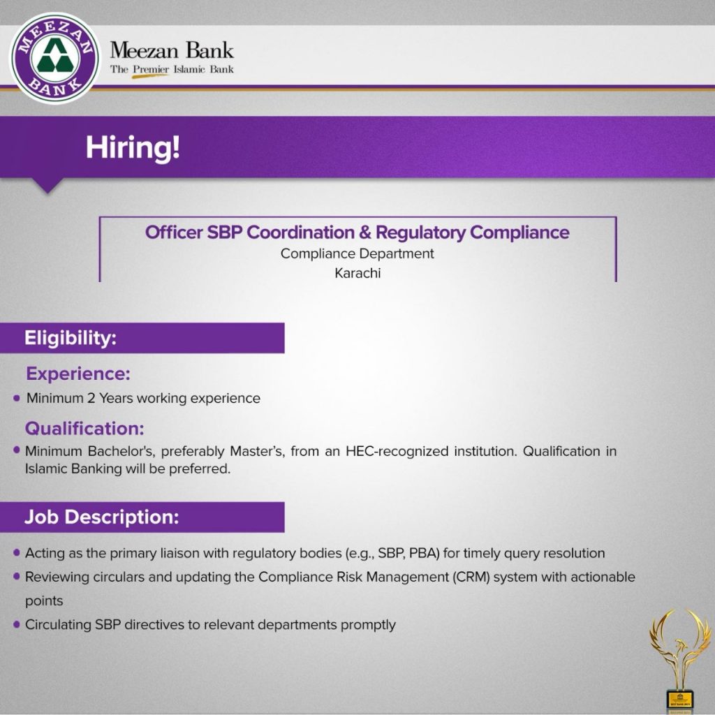 Islamabad, June 21, 2025: Meezan Bank, recognized as The Premier Islamic Bank and honored multiple times as the Best Bank of Pakistan, is now offering exciting job opportunities for professionals across the country. The bank is hiring for two major positions: Officer SBP Coordination & Regulatory Compliance in Karachi, and Personal Banking Officer for multiple cities.