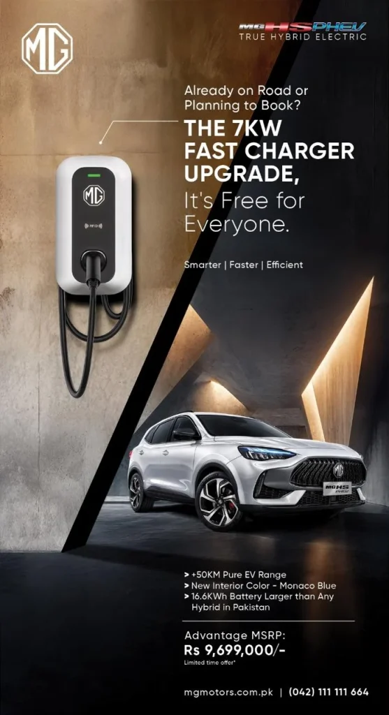 Islamabad, 5 May, 2025: MG Pakistan has announced a major upgrade to its popular plug-in hybrid SUV, the MG HS PHEV, by introducing a 7KW fast charger as a standard replacement for the existing portable charger.