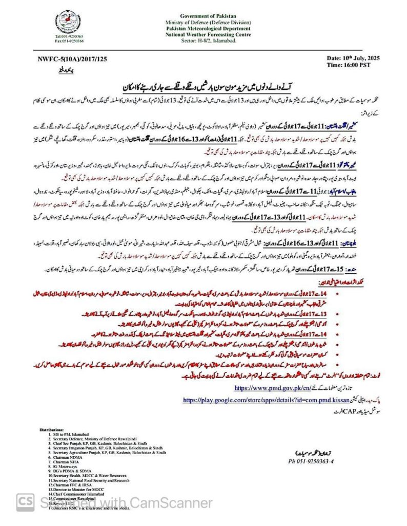 - Kashmir & Gilgit-Baltistan (July 11–17): Areas including Muzaffarabad, Rawalakot, Kotli, Mirpur, Diamer, Astore, Skardu, and Hunza will witness scattered rain with thunder, with a chance of very heavy rainfall at times.