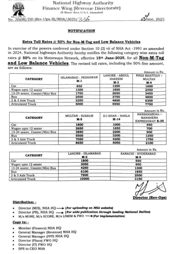 ISLAMABAD, June 3, 2025: Vehicles who do not have M-tags or have insufficient balance will now be charged 50% additional toll tax on Motorways, a notification issued by the National Highway Authority (NHA) said.