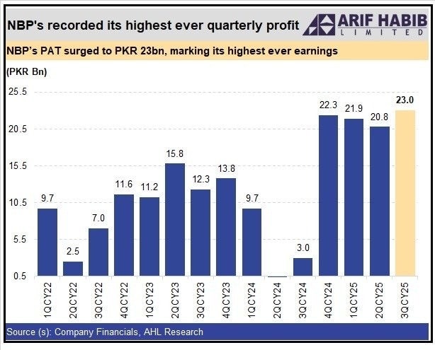 According to brokerage house Arif Habib Limited, the bank reported its highest ever quarterly profit in 3QCY25 of Rs. 23 billion