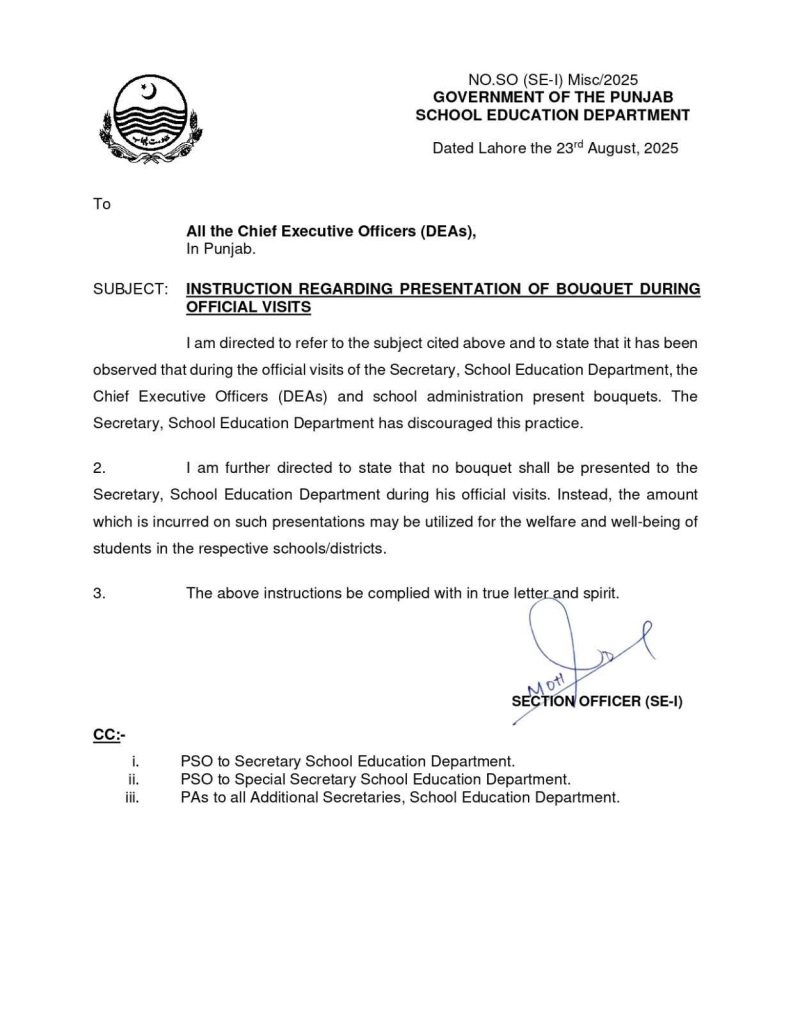The Punjab School Education Department in an official notification has directed that no bouquet be presented during the official visits of its Secretary. The new instruction applies to all Chief Executive Officers (DEAs) and school administrations across the province.