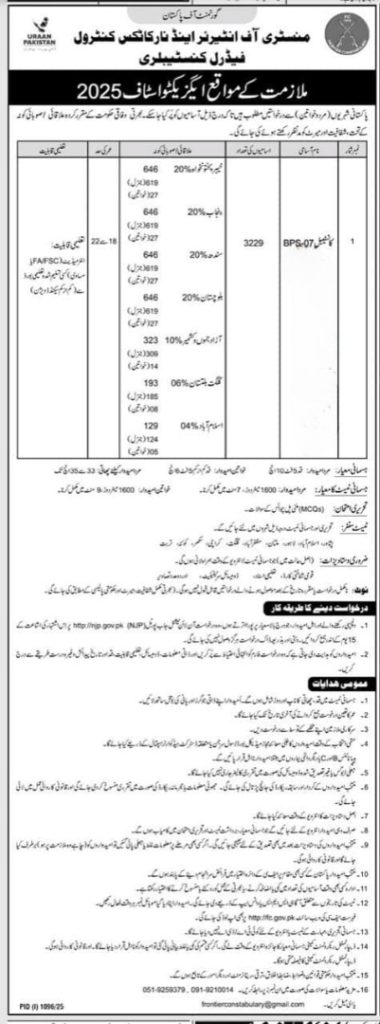 Islamabad, Aug 12, 2025: The Ministry of Interior and Narcotics Control Jobs 2025 has officially opened applications for Constable (BPS-07) positions for 2025. A total of 3,229 seats have been allocated under various provincial, minority, and women quotas.