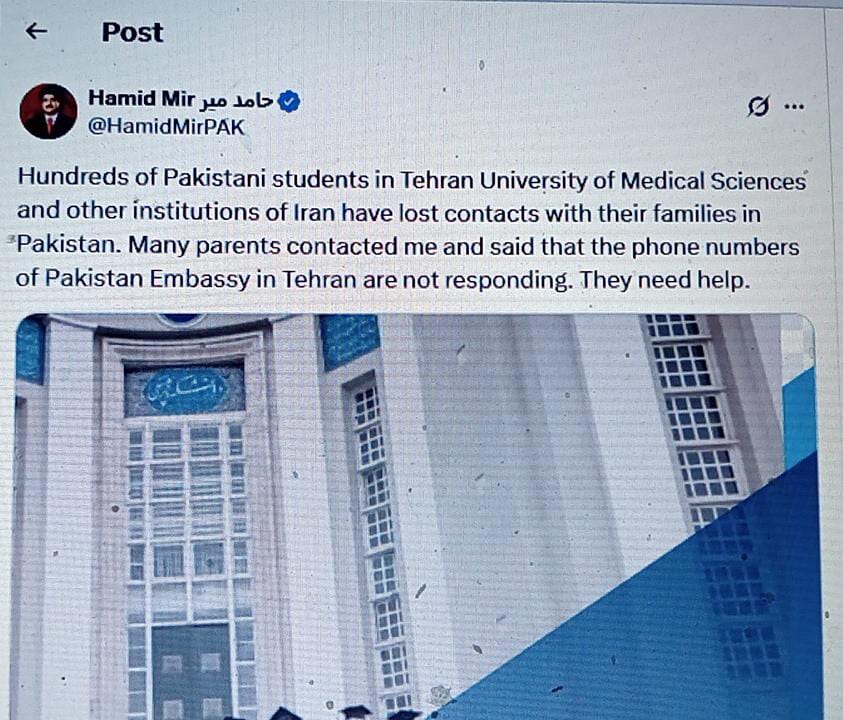 Renowned Pakistani journalist Hamid Mir brought this alarming issue to light on X (formerly Twitter), writing: “More than 5000 Pakistani students and families are stranded in Iran. They have lost contact with their families in Pakistan. Embassy not responding properly.” His tweet quickly went viral, drawing attention from the public, media, and political figures who are now demanding immediate action from the Pakistani government.