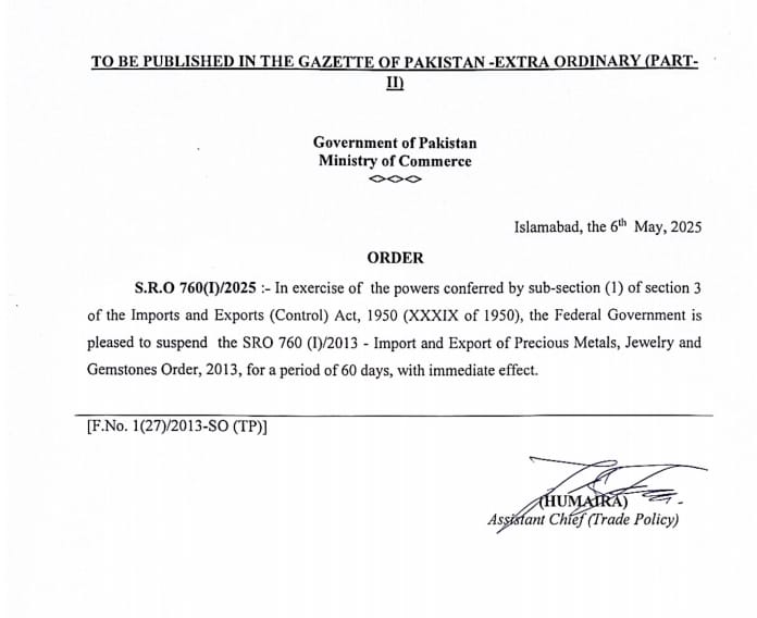 It reads as, “In exercise of the powers conferred by sub-section (1) of section 3 of the Imports and Exports (Control) Act, 1950 (XXXIX of 1950), the Federal Government is pleased to suspend the SRO 760 (1)/2013 – Import and Export of Precious Metals, Jewelry and Gemstones Order, 2013, for a period of 60 days, with immediate effect”.