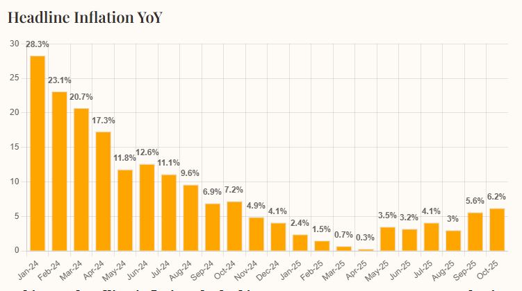The Consumer Price Index (CPI) was 5.6% in September 2025 and stood at 6.9% in October 2024. On a month-to-month basis, prices increased by 1.8% in October 2025, slightly below September’s 2% rise but higher than the 1.2% increase in October 2024. Experts at Optimus Capital Management said this is the highest monthly inflation since November 2024.