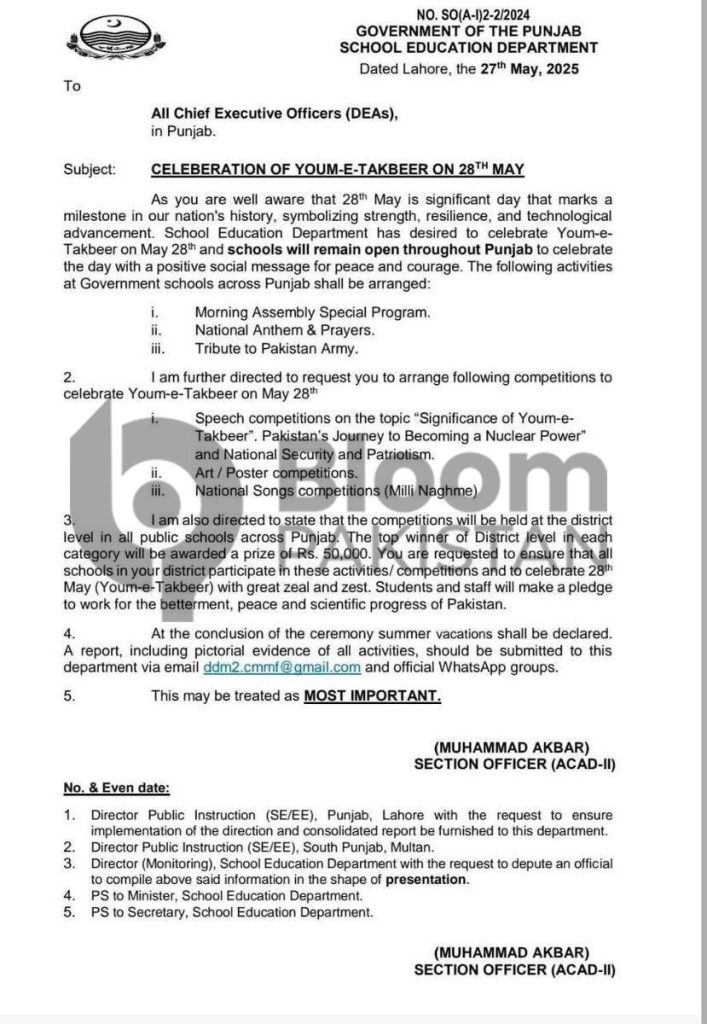 Meanwhile, the Government of Punjab has announced that schools will remain open across the province on the occasion of Youm-e-Takbeer.