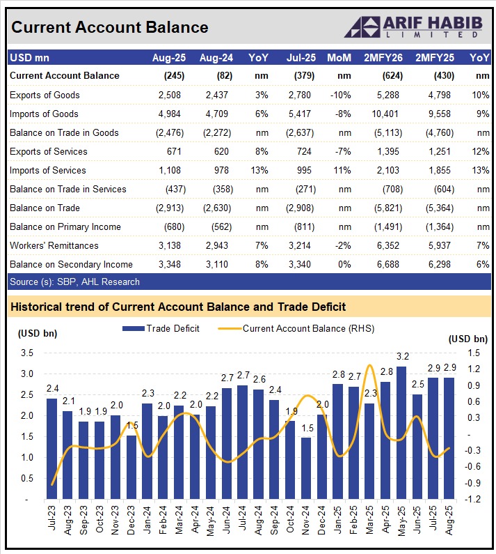 Pakistan’s current account balance posted a deficit of $245 million in August 2025, compared to a deficit of $82 million in the same month of last year.