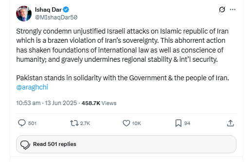 “Strongly condemn unjustified Israeli attacks on Islamic Republic of Iran which is a brazen violation of Iran’s sovereignty. This abhorrent action has shaken foundations of international law as well as conscience of humanity, and gravely undermines regional stability and international security. Pakistan stands in solidarity with the Government and the people of Iran.”