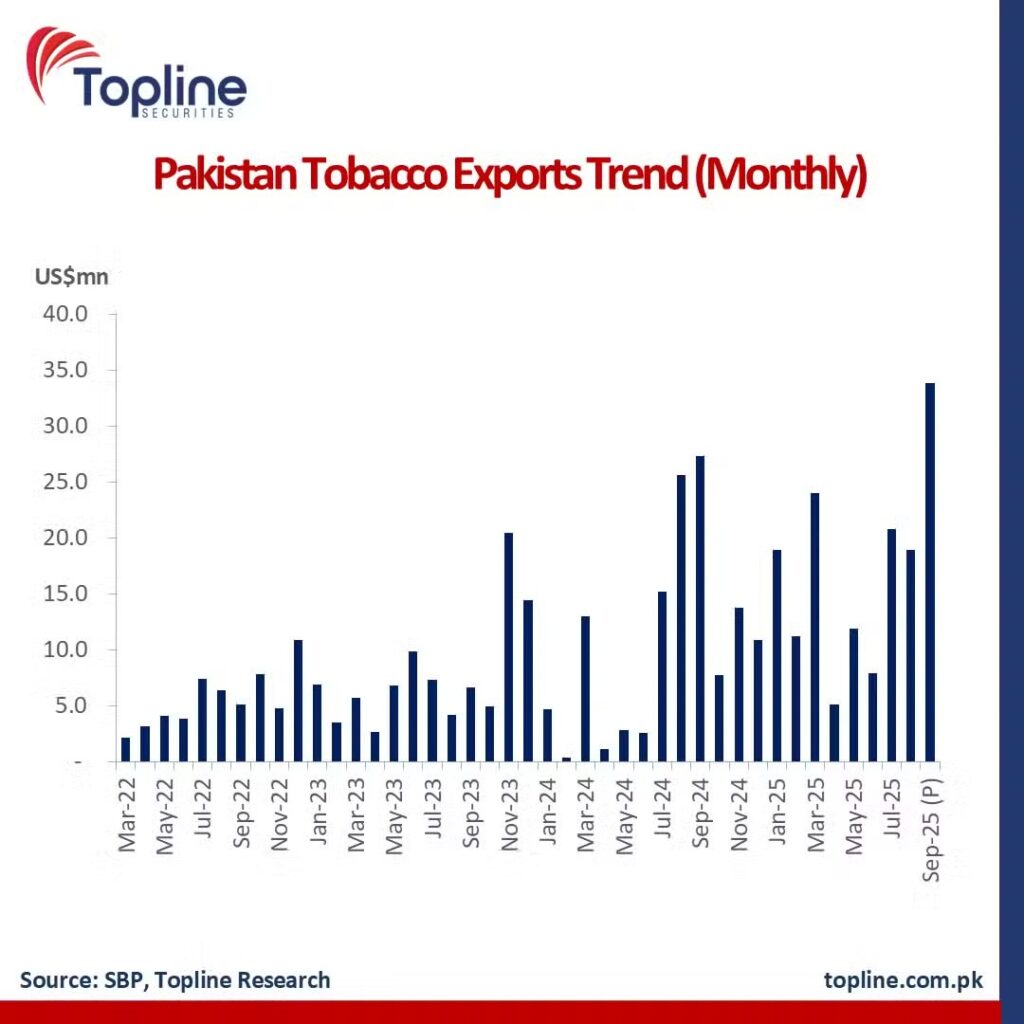 Pakistan achieved a new monthly milestone as tobacco exports reached $34 million in September 2025, according to the latest figures released by the State Bank of Pakistan (SBP). This marks the highest-ever monthly export for the tobacco sector in the country’s history.