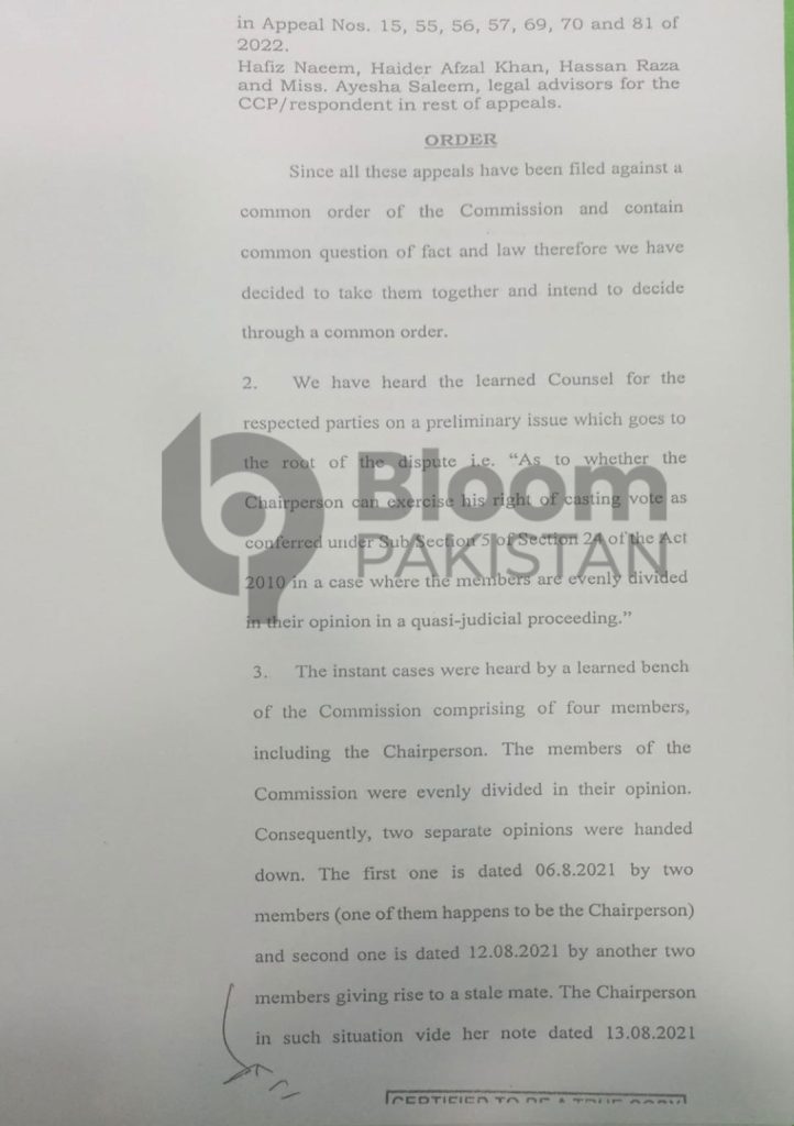 To break the deadlock, the then Chairperson Rahat Kaunain exercised a casting vote under Subsection 5 of Section 24 of the Competition Act, 2010, through a note dated August 13, 2021 effectively converting the stalemate into a majority ruling that upheld the penalty.