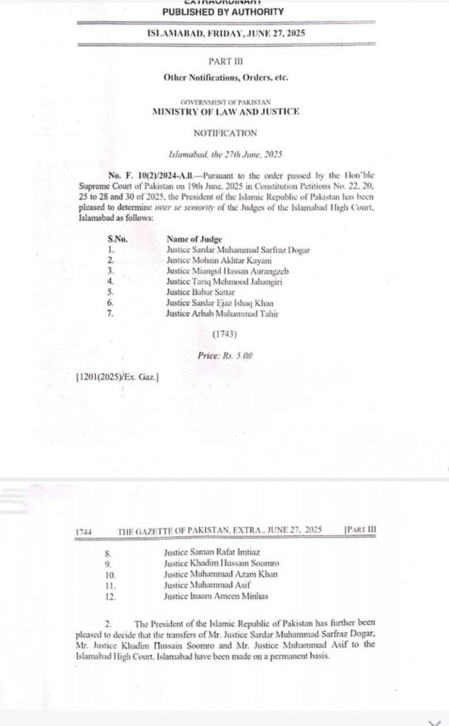 ISLAMABAD – June 27, 2025: The President of Pakistan has officially finalized the seniority list of judges serving at the Islamabad High Court (IHC), following the Supreme Court’s directive issued on June 19, 2025. The notification, released by the Ministry of Law and Justice and published in the Gazette of Pakistan, establishes the inter se seniority of twelve judges currently posted at the IHC.
