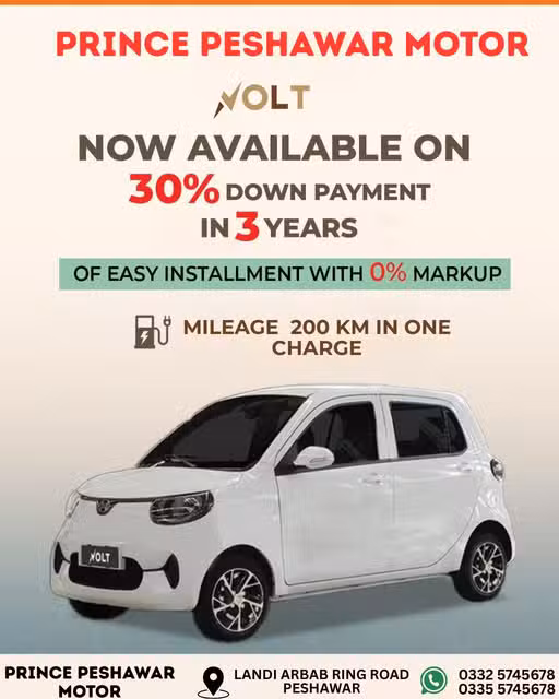 The Volt electric car is available at Prince Peshawar Motor, situated on Landi Arbab Ring Road, Peshawar. Potential buyers can reach out at 0332-5745678 or 0335-5745678 for additional information or to make an appointment.