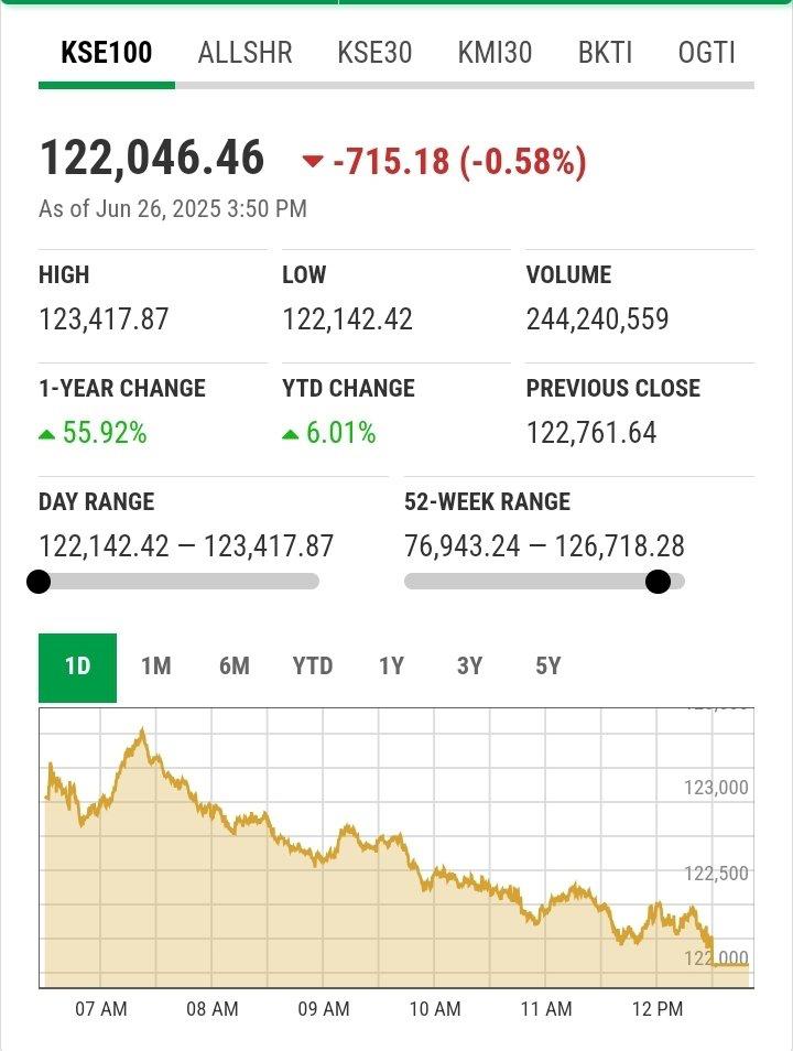 Islamabad, June 26, 2025: The Pakistan Stock Exchange (PSX) closed in the red on Thursday, with the benchmark KSE-100 Index shedding 715 points, or 0.58%, to settle at 122,046. This decline follows two sessions of strong gains, as investors opted for profit-taking ahead of the fiscal year-end.