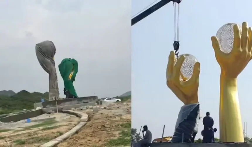 The artwork featuring two outstretched hands holding circular orbs was being installed by a private housing society as part of its corporate social responsibility campaign. However, uploads of the structure circulating online sparked mockery and criticism about its relevance for a major public space.