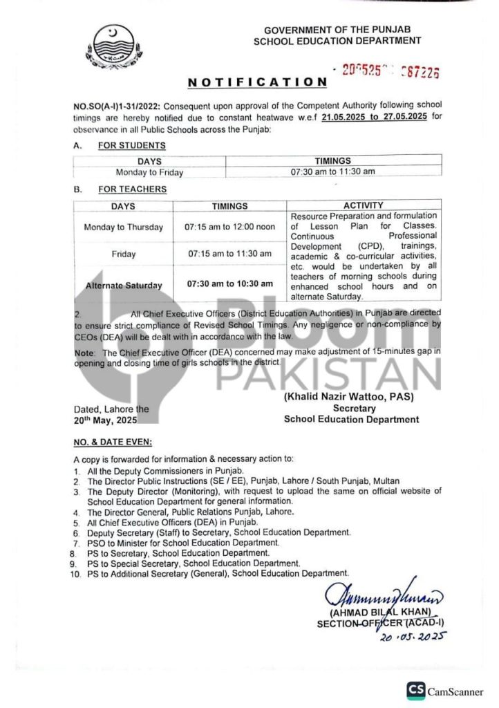 Islamabad, May 20, 2025: Amid rising temperatures across Punjab, the School Education Department has issued two separate notifications revising school timings and declaring summer vacations for both public and private educational institutions.