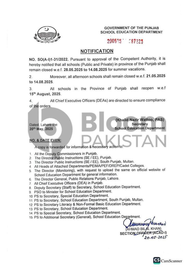 In another notification, the Punjab government declared summer vacations for all public and private schools from 28 May to 14 August 2025.