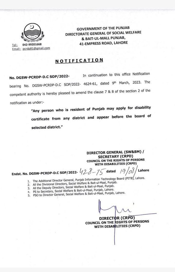 According to an official notification issued by the Directorate General of Social Welfare & Bait-ul-Maal, Lahore, any person residing in Punjab can now apply for a disability certificate from any district. The applicants are also allowed to appear before the board of the district of their choice.