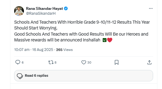 Islamabad, Aug 16, 2025: Punjab Education Minister Rana Sikandar Hayat has delivered a firm message to school teachers following the announcement of this year’s matric exam results.