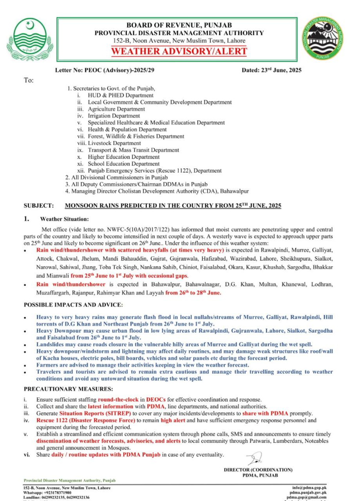Islamabad, June 24, 2025: The Provincial Disaster Management Authority (PDMA) Punjab has warned that strong monsoon rain will start from 25th June, 2025 in different areas of Punjab. An alert for possible urban flooding in low-lying areas has also been issued. A notice is issued to all departments and district officers, asking them to stay alert.