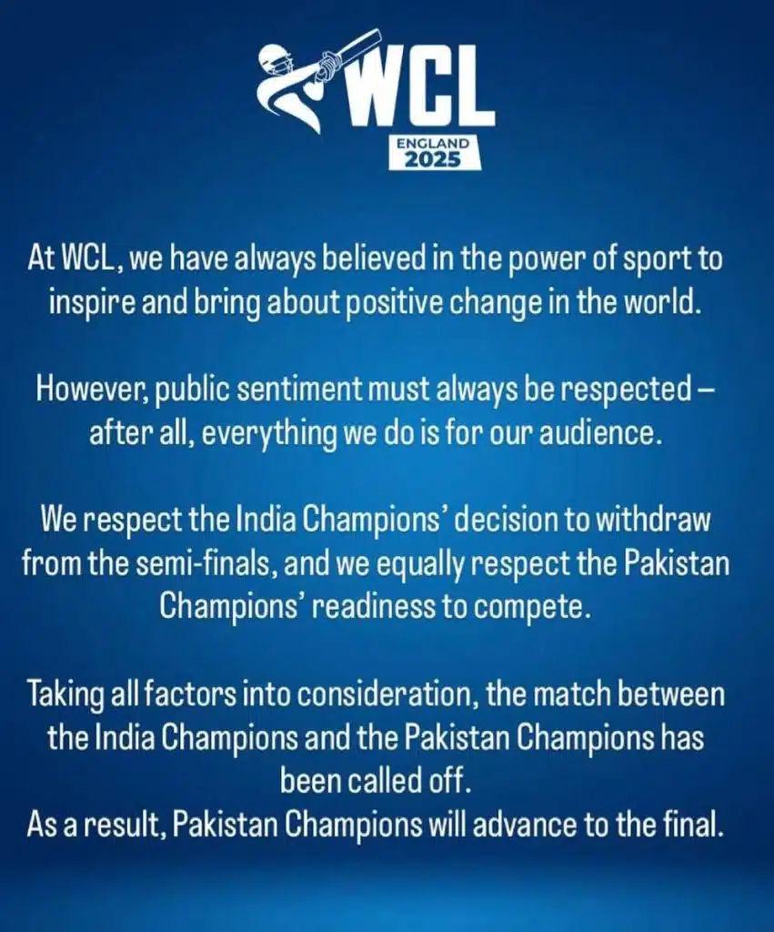 Islamabad, July 31, 2025: Pakistan advanced to the World Championship of Legends final after India withdrew from the semi-final clash, clearing the path for the Green Team to compete for the title in a dramatic turn of events.