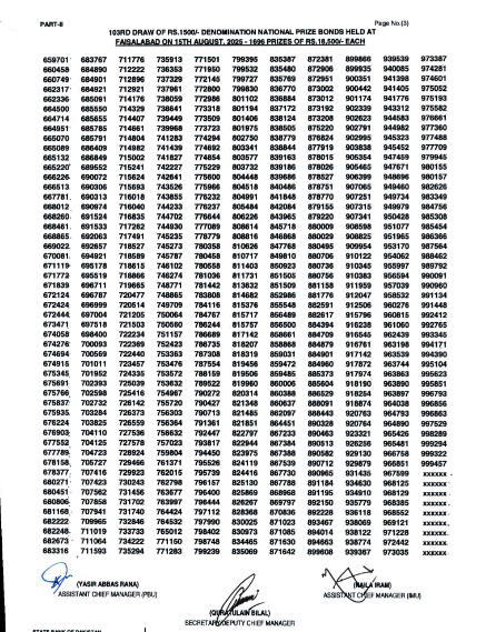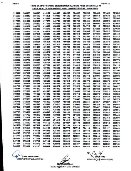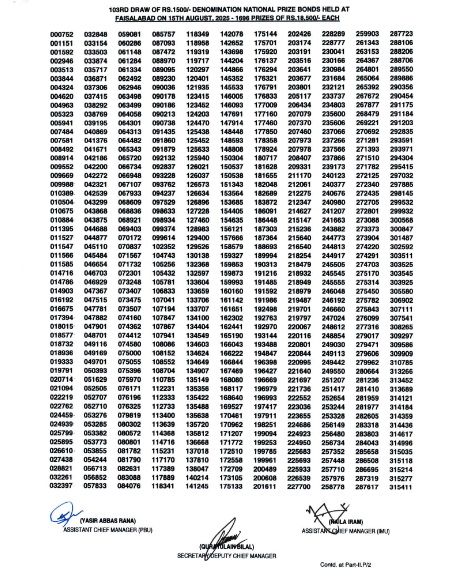 The 103rd draw for the Rs 1500 Prize Bond was conducted at the National Savings Center, Faisalabad, under the supervision of the Central Directorate of National Savings. Below are the winning details: