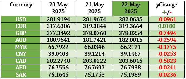 Islamabad, May 22, 2025: The Pakistani rupee (PKR) ended weaker against the US Dollar (USD), British Pound, and the majority of other leading currencies on Wednesday.