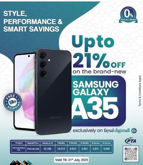 Islamabad, July 30, 2025: Looking to upgrade your smartphone? Now is the perfect time! The Samsung Galaxy A35 price in Pakistan has been slashed by up to 21% at Faysal Digimall, making this stylish and high-performance device more affordable than ever.