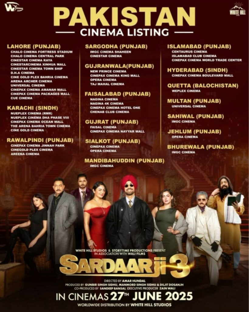 Islamabad, June 27, 2025: Sardaar Ji 3, the much-anticipated Punjabi blockbuster starring Diljit Dosanjh and Hania Aamir, officially hits cinemas across Pakistan today, June 25, 2025. The film has received clearance from all three Pakistani censor boards—Sindh, Punjab, and the federal board—paving the way for its nationwide release.