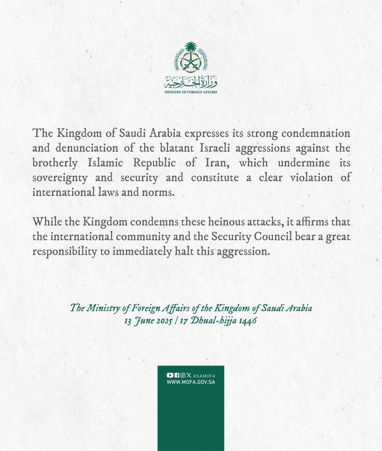 “The Kingdom of Saudi Arabia expresses its strong condemnation and denunciation of the blatant Israeli aggressions against the brotherly Islamic Republic of Iran, which undermine its sovereignty and security and constitute a clear violation of international laws and norms,” the statement read.