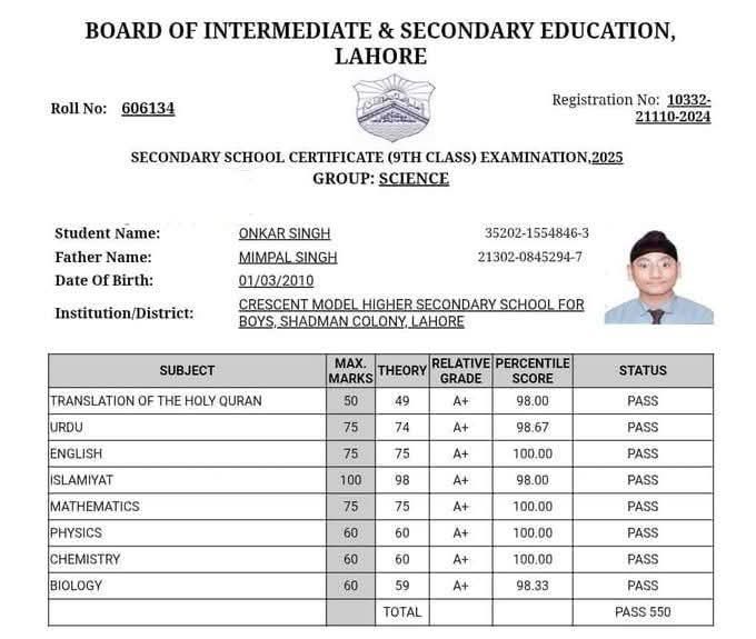 Sikh teen Onkar Singh tops Lahore Board Class 9 with 550/555 marks, scoring 98 in Islamiyat and near-perfect in Quran translation.