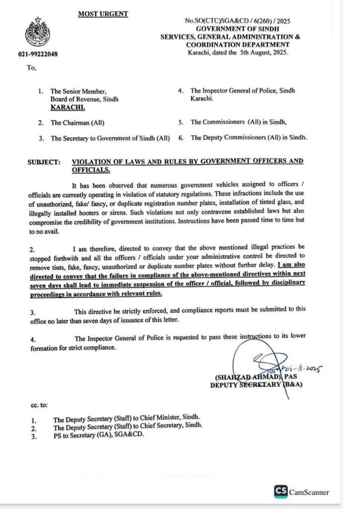 Islamabad, Aug 6, 2025: The Sindh Government has issued a strong warning to all officers and staff using official vehicles, ordering them to immediately stop illegal changes made to government-assigned cars.