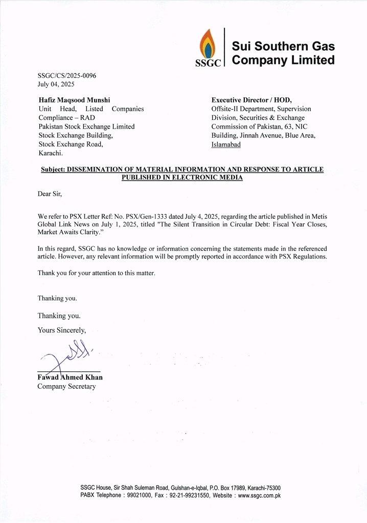 In a letter sent to the Pakistan Stock Exchange (PSX) and the Securities and Exchange Commission of Pakistan (SECP), SSGC clarified that it had no information or involvement related to the claims made in an article published by Metis Global Link News on July 1, 2025, titled “The Silent Transition in Circular Debt: Fiscal Year Closes, Market Awaits Clarity.”