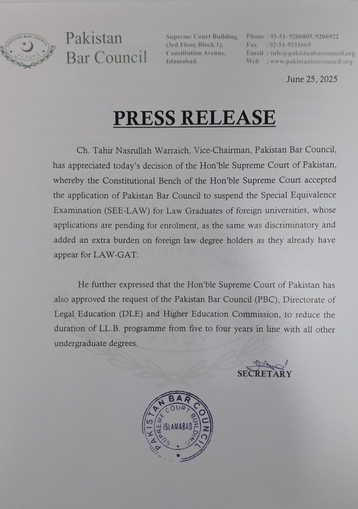 Ch. Tahir Nasrullah Warraich, Vice-Chairman, Pakistan Bar Council, has appreciated today’s decision of the Hon’ble Supreme Court of Pakistan, whereby the Constitutional Bench of the Hon’ble Supreme Court accepted the application of Pakistan Bar Council to suspend the Special Equivalence Examination (SEE-LAW) for Law Graduates of foreign universities, whose applications are pending for enrolment, as the same was discriminatory and added an extra burden on foreign law degree holders as they already have appear for LAW-GAT.