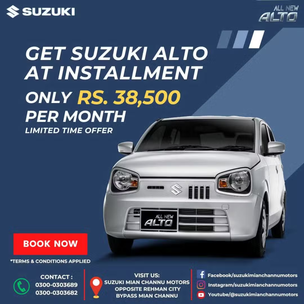 Islamabad, July 17, 2025: After a recent increase in car prices, Suzuki Mian Channu Motors is now offering the Suzuki Alto on easy monthly instalments. This offer comes as good news for people who are finding it hard to buy a car due to high prices.