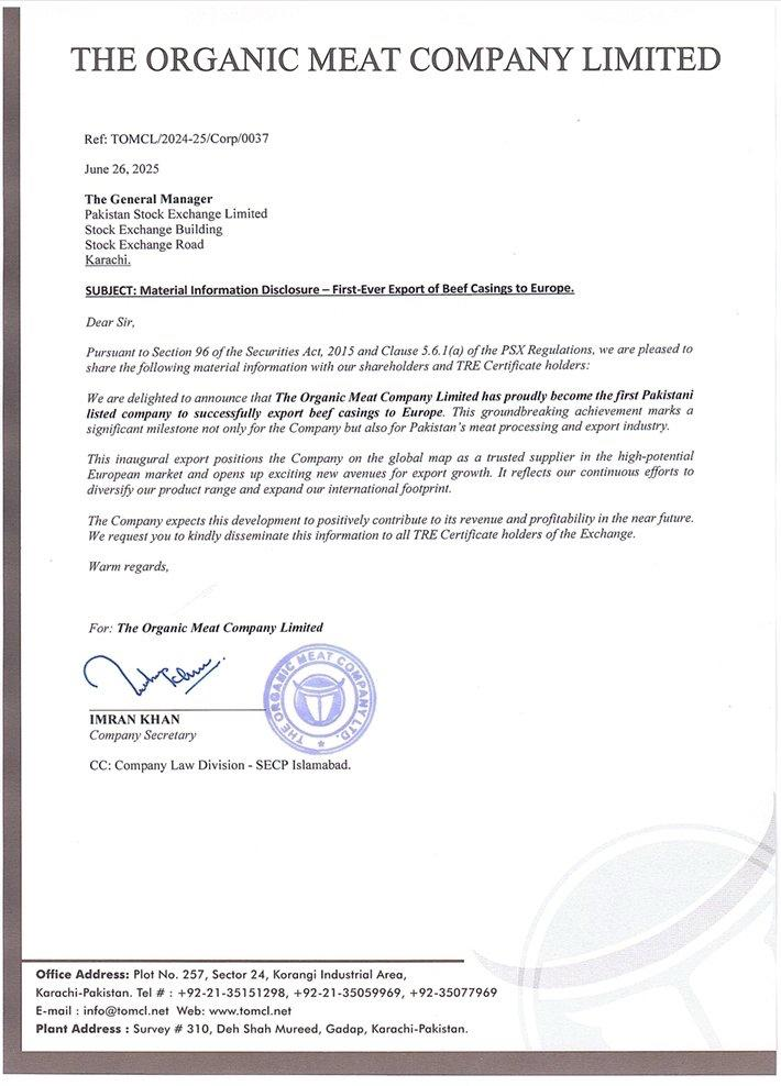 Islamabad, June 26, 2025: The Organic Meat Company Limited (TOMCL) has made history by becoming the first listed Pakistani company to export beef casings to Europe.