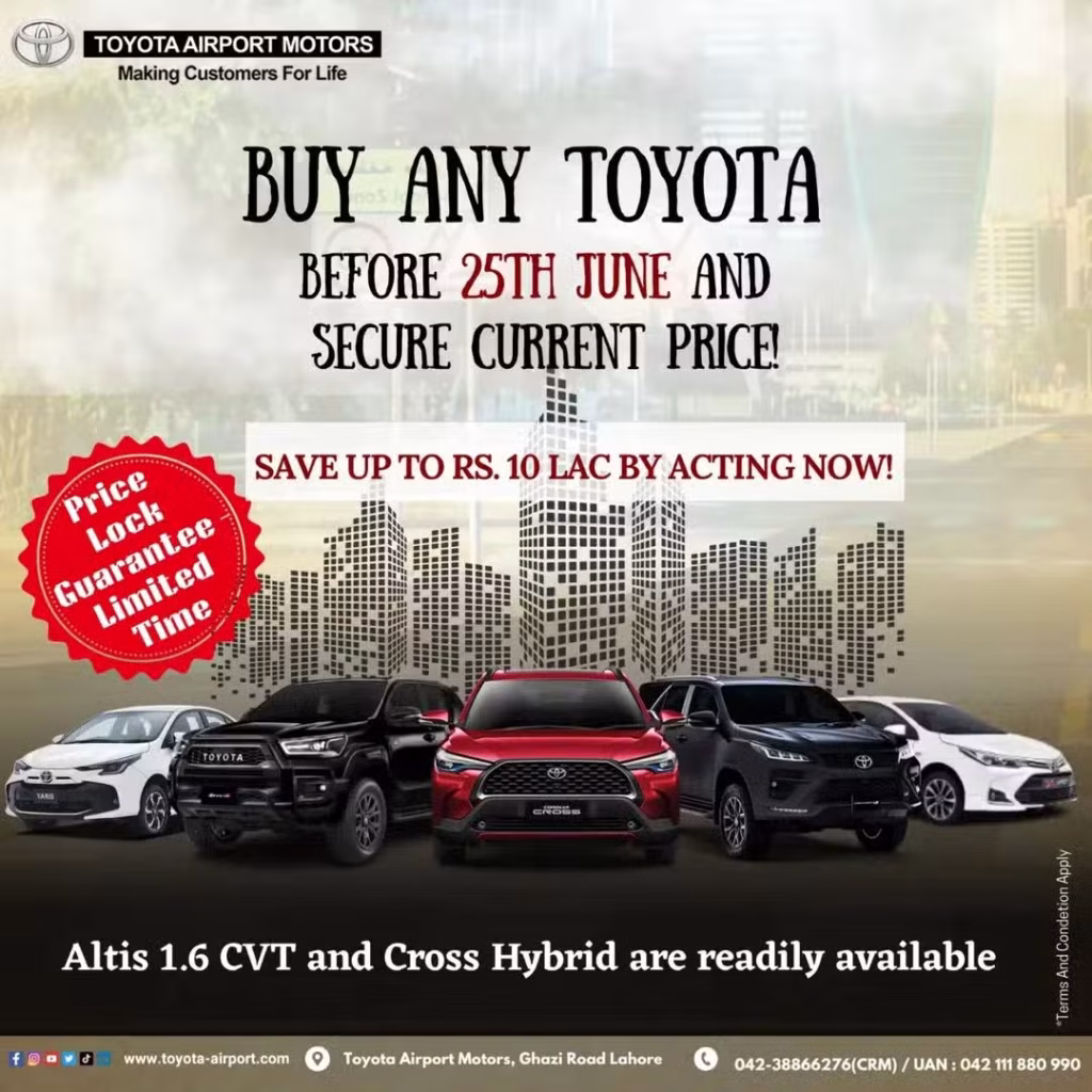Islamabad, June 18, 2025: In a strategic move to stay ahead of expected tax increases, Toyota Airport Motors has rolled out a limited-time pre-budget promotional offer, giving customers the opportunity to book any Toyota model at current prices before June 25, 2025.