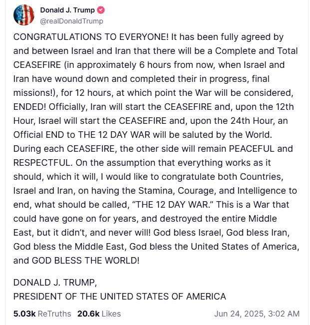 Islamabad, June 24, 2025: In a dramatic development, U.S. President Donald J. Trump announced a “Complete and Total CEASEFIRE” between Israel and Iran, effectively bringing an end to what he dubbed “The 12-Day War.” The ceasefire will take effect in stages, with Iran beginning its pause first, followed by Israel 12 hours later. If upheld, the ceasefire will mark the official end of hostilities within 24 hours.