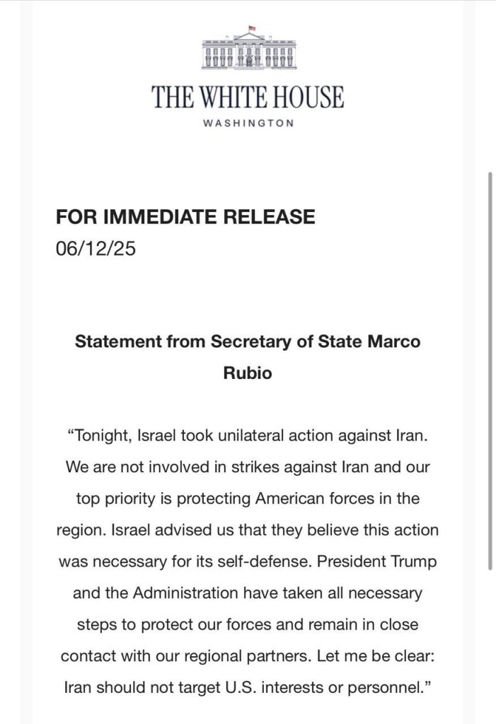 U.S. Secretary of State and National Security Adviser Marco Rubio issued a statement Friday asserting that the United States was not involved in Israel’s attacks on Iran and issued a strong warning to Tehran: “Let me be clear — Iran should not target U.S. interests or personnel. Our top priority is protecting American forces in the region.”