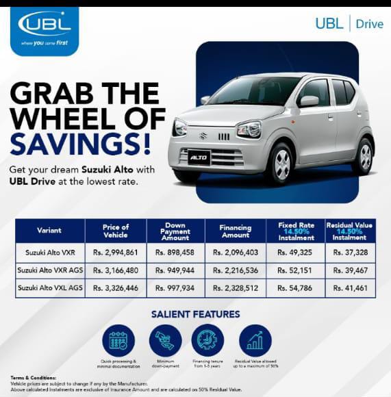 Islamabad, July 24, 2025: UBL Drive has launched an unbeatable auto financing offer, making it easier than ever to own your dream car. With the UBL Drive Suzuki Alto financing plan, customers can now grab the wheel of the brand-new Suzuki Alto at the lowest fixed rate of 14.5%, making it one of the most affordable auto financing options in Pakistan.