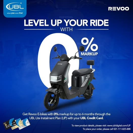 Islamabad, July 6, 2025: United Bank Limited (UBL) has introduced a special offer for its credit card users, making it easier to shift towards electric transport. Under this limited-time offer, customers can purchase Revoo electric bikes with 0% markup using the UBL Lite Instalment Plan (LIP).