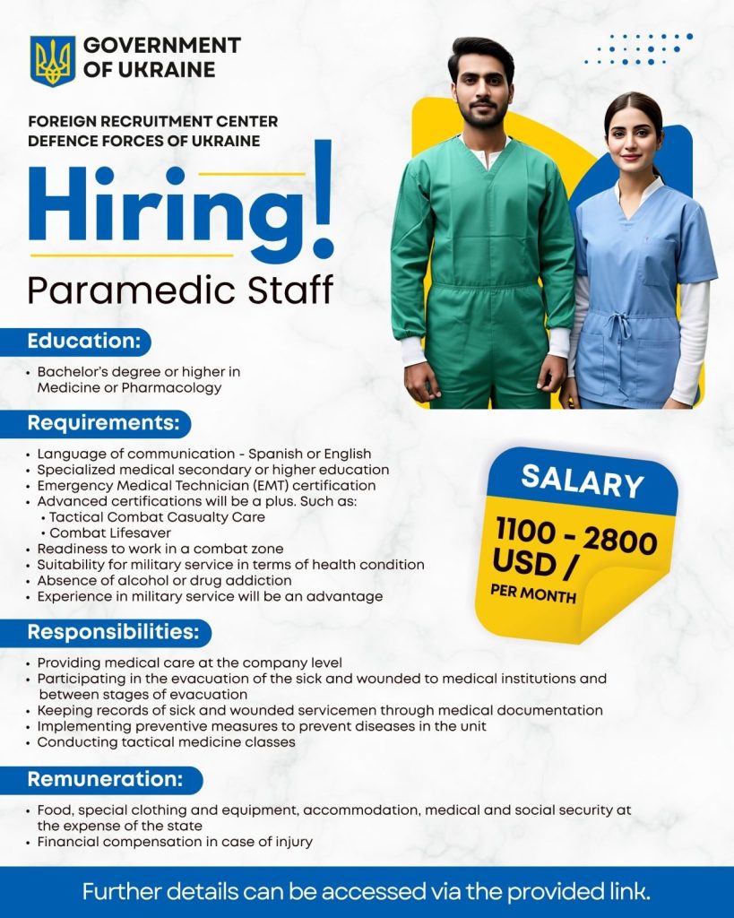 Islamabad, June 19, 2025: The Foreign Recruitment Center of the Defence Forces of Ukraine has announced urgent openings for paramedic staff to serve in active combat zones. The recruitment is open to qualified medical professionals with a Bachelor’s degree or higher in Medicine or Pharmacology.