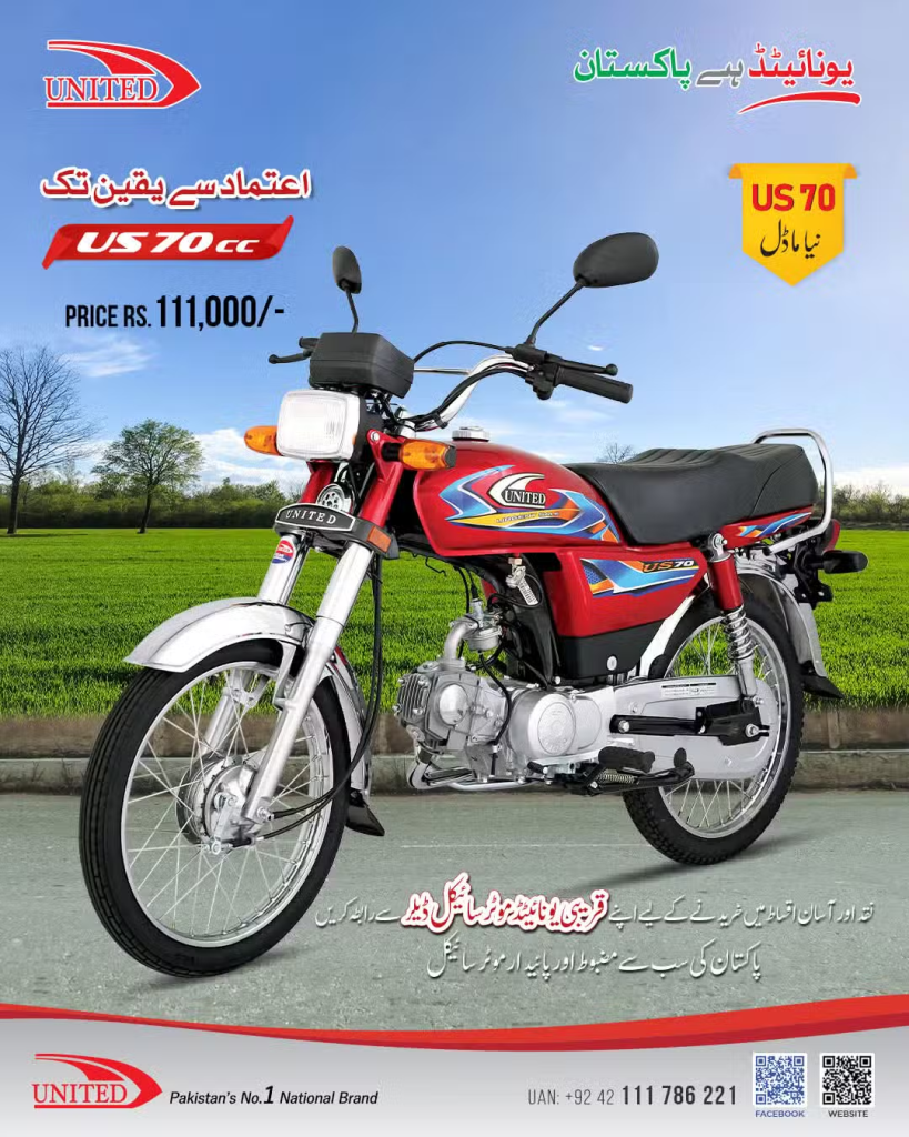 United, which refers to itself as Pakistan’s top local motorcycle brand, continues to promote the 70cc as one of the most widely used and budget-friendly motorcycles in the country.
