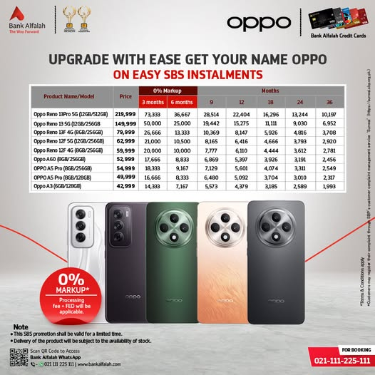 So, if you have a Bank Alfalah credit card, this is your chance to upgrade to a new Oppo phone without paying all at once. Visit the website link or call 021-111-225-111 for full details and booking.