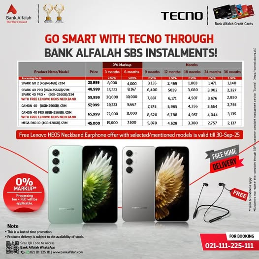 Bank Alfalah has also announced a limited-time offer of free Lenovo HE05 neckband earphones on selected models which is valid until September 30, 2025. The initiative is aimed at helping more people upgrade to modern Tecno devices without financial strain.