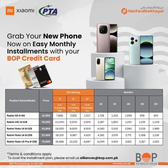 Looking for the newest Xiaomi smartphones? Now, owning your favorite device is easier than ever with The Bank of Punjab (BOP) Credit Card. Enjoy flexible monthly installment plans with 0% markup, making your dream phone just a few clicks away.