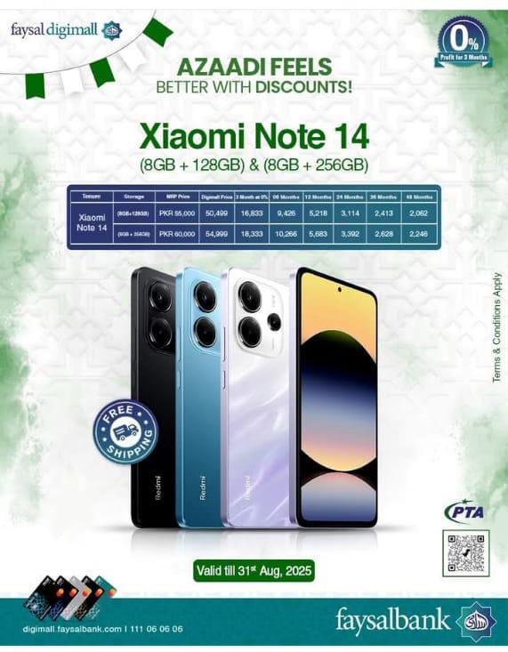 Islamabad, Aug 9, 2025: Faysal Digimall has rolled out a massive price slash on the all-new Xiaomi Note 14, giving smartphone lovers a reason to celebrate this Azadi season. The latest deal lets customers grab the Xiaomi Note 14 in 8GB/128GB and 8GB/256GB variants with 0% profit for 3 months and installment plans of up to 48 months, starting from just Rs. 2,062/month.