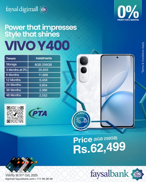 Priced at Rs. 62,499, the Vivo Y400 combines power and style, offering both performance and value. The 0% profit installment plan aims to make the device accessible to a wider audience through Faysal Bank’s Digimall platform.